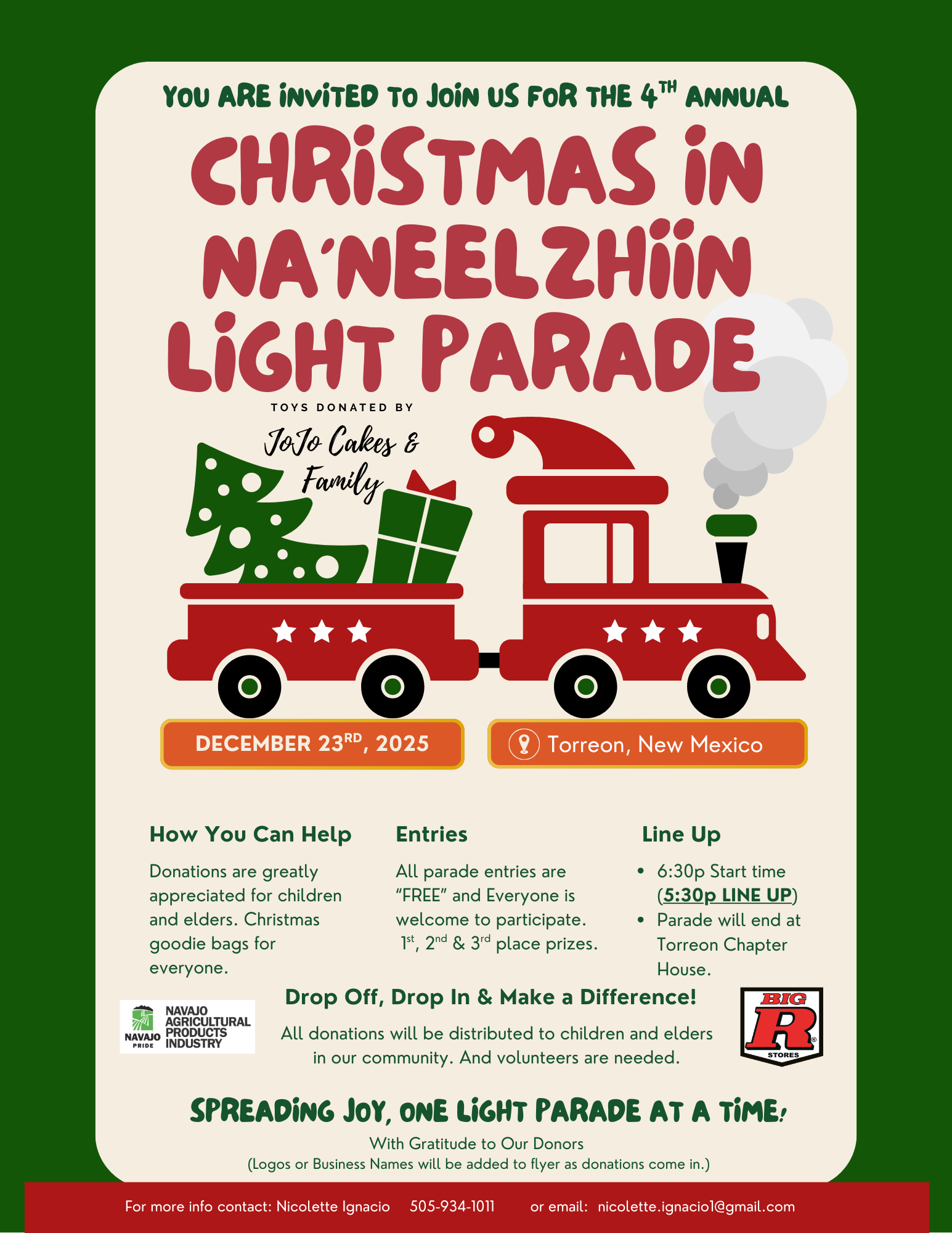 As we celebrate the holidays, we cordially invite you to join us at our 4th Annual Christmas Light Parade in Na’Neelzhiin.